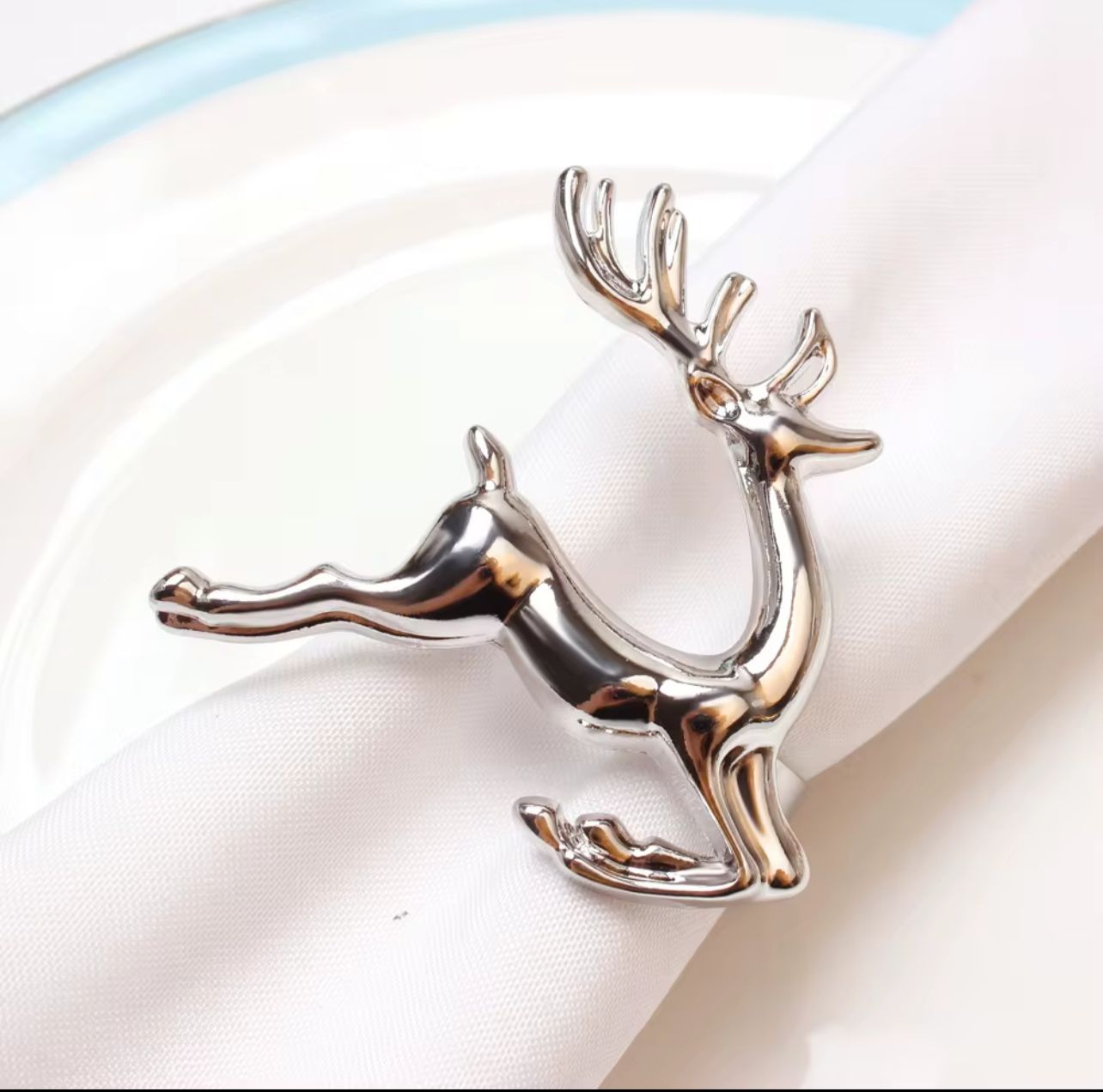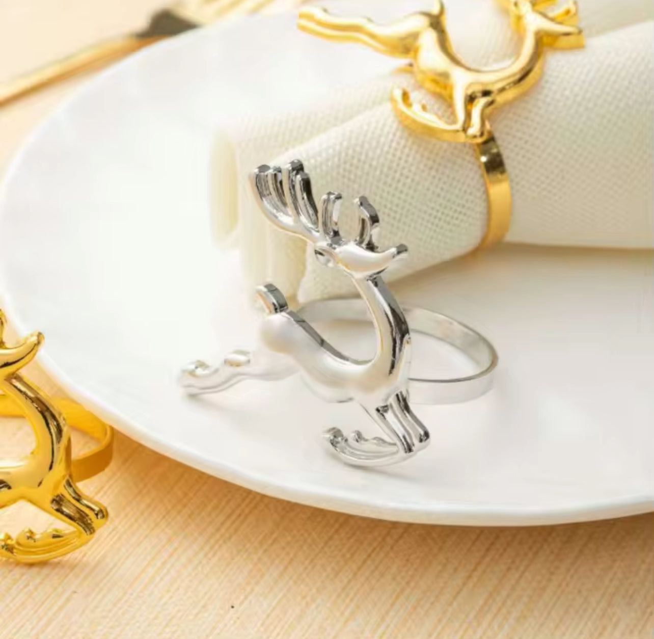 Añade un detalle elegante y festivo a tu mesa con estos hermosos aros de servilleta con figura de reno. Hechos en metal resistente, disponibles en color dorado 🌟 y plateado ❄️, son el complemento perfecto para realzar tu decoración navideña.