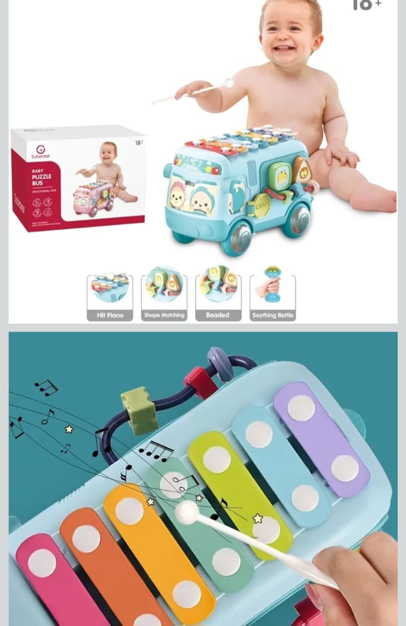 Combina un autobus, con piezas para encajar, maracas (llantas) y xilófono.