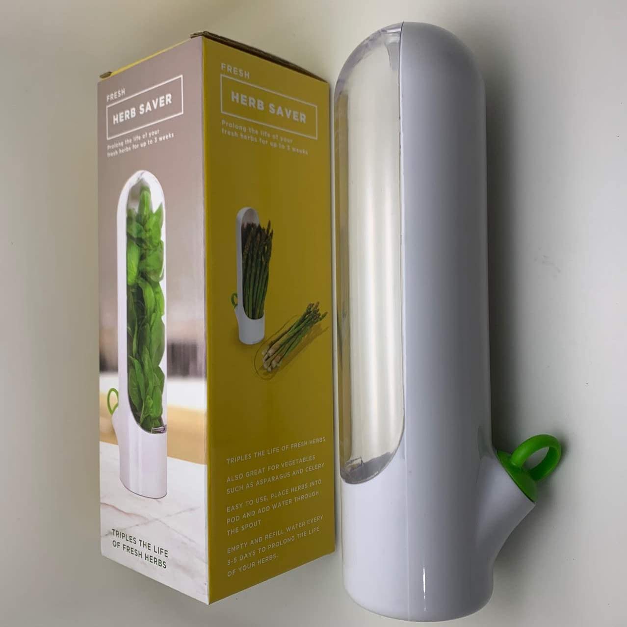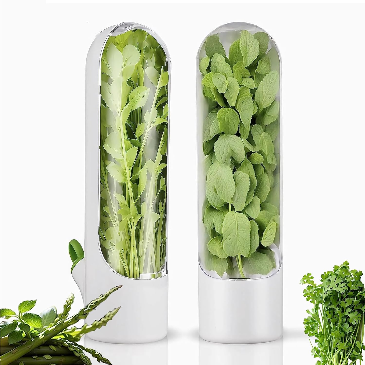 Es un recipiente alargado y transparente que mantiene hierbas como cilantro, perejil, albahaca, menta o espárragos frescos por más tiempo. Funciona colocando las hierbas dentro del tubo y llenando con un poco de agua en la base. El diseño hermético y vertical evita que se marchiten y facilita guardarlo en la puerta o en los estantes del refrigerador sin ocupar mucho espacio.