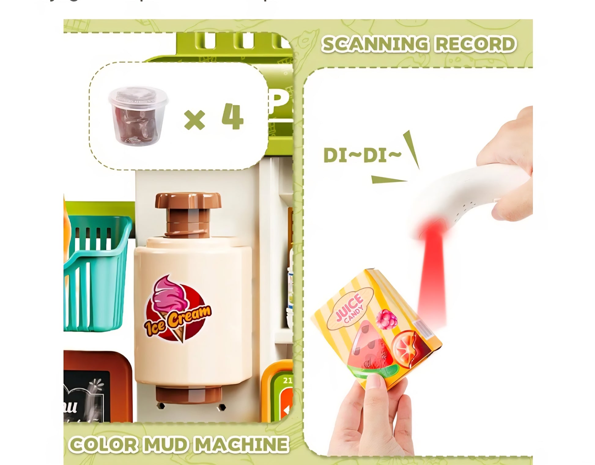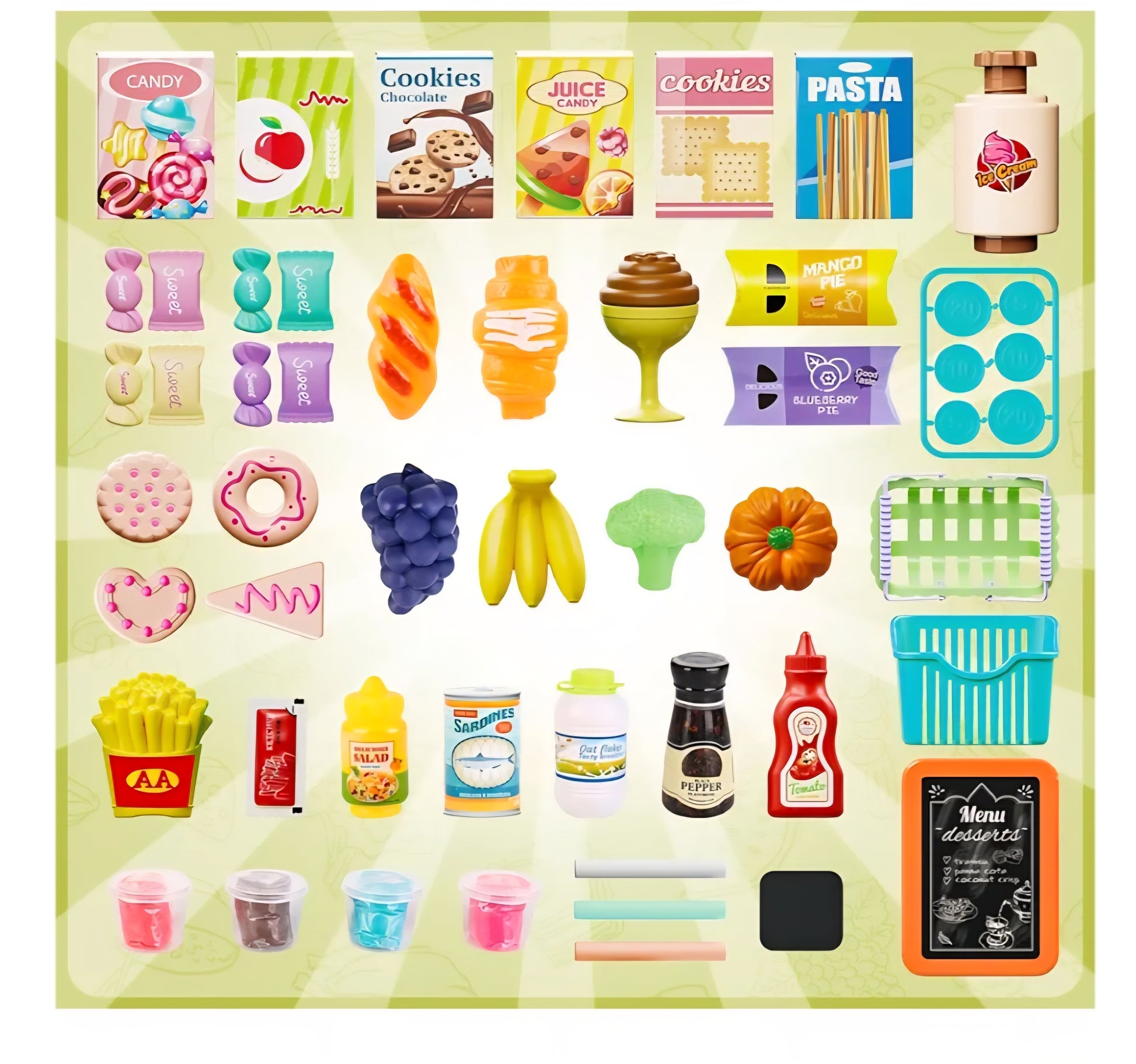 Mini supermercado interactivo, Incluye mostrador, estantes, caja registradora, monedas, dispensador de sorbetes con plastilina, simulador de lector de códigos con sonido y más de 50 accesorios como frutas, verduras, galletas, helados, bebidas y productos de supermercado.