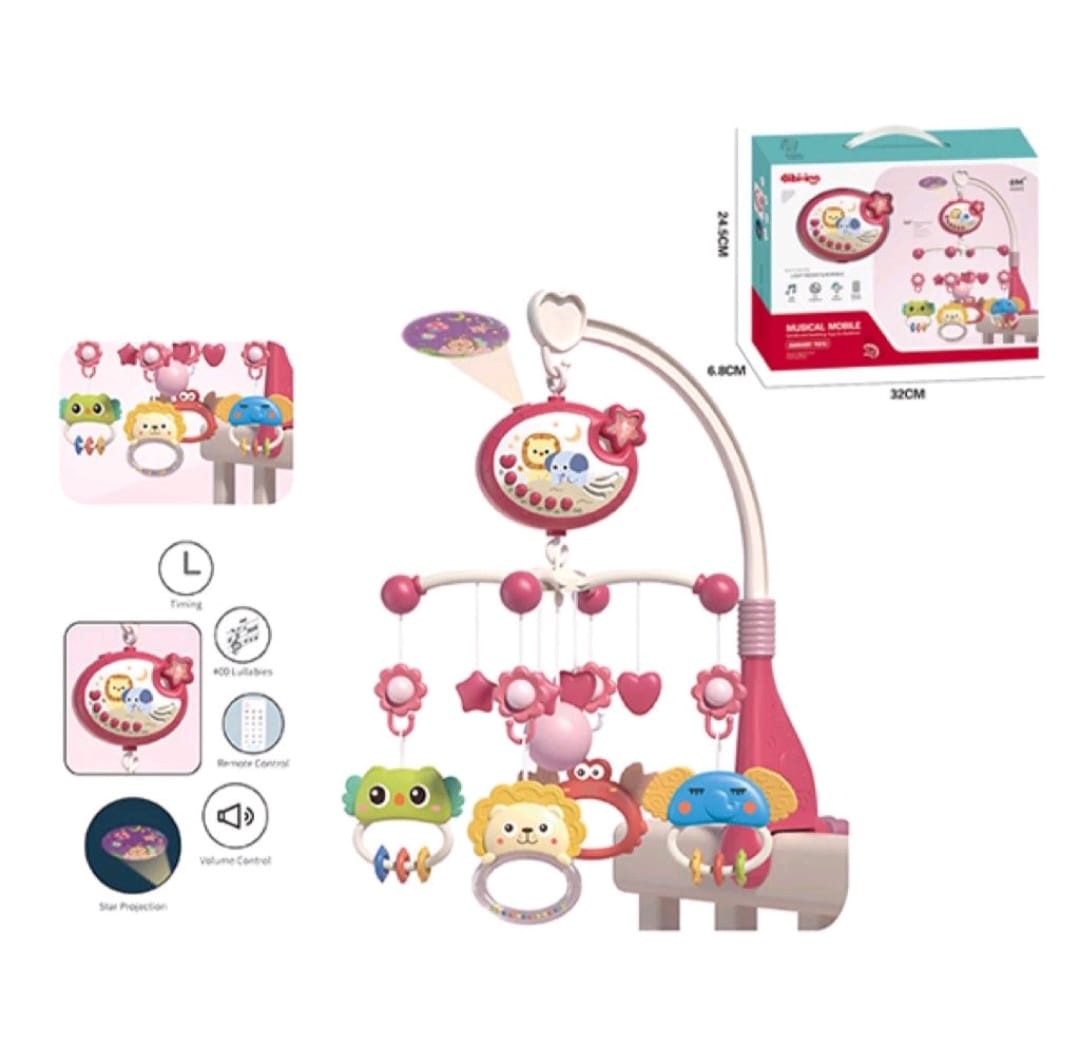 Móvil musical para cuna con proyector y control remoto.