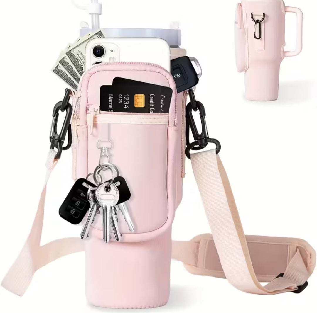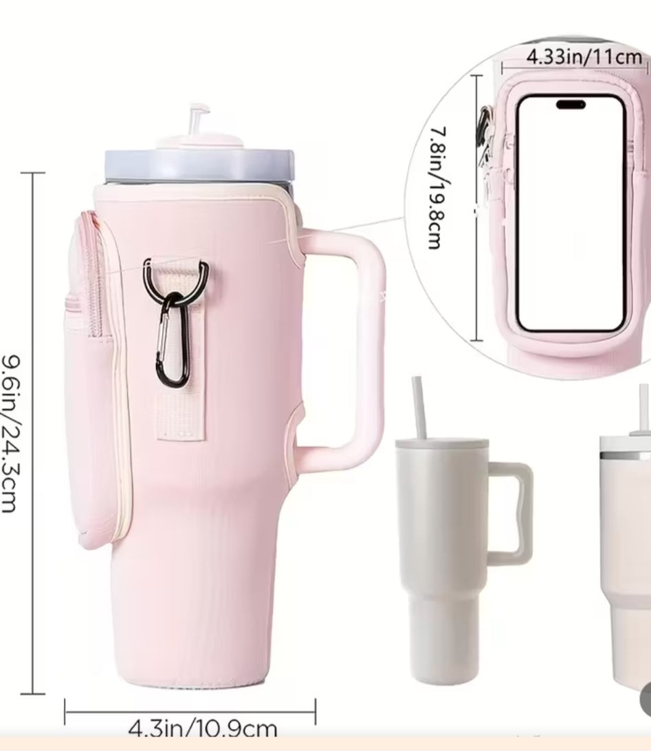 Este producto es un portavasos con correa y bolsillo multifuncional diseñado especialmente para vasos grandes tipo tumbler o termos.