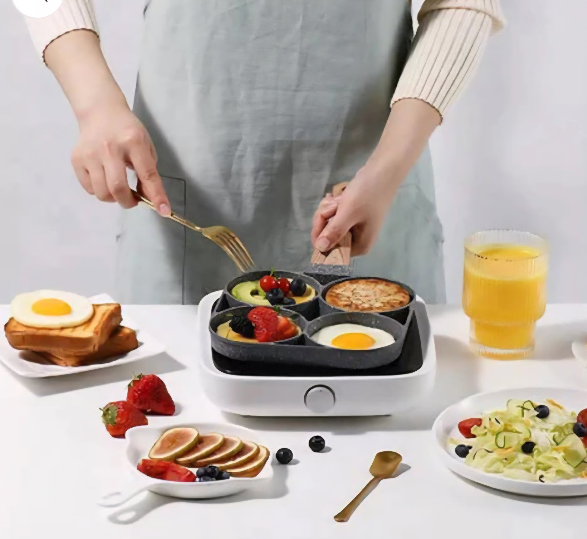 🔹 Diseño con 4 cavidades: ideal para cocinar huevos, panqueques, mini tortillas, hamburguesas o verduras al mismo tiempo.