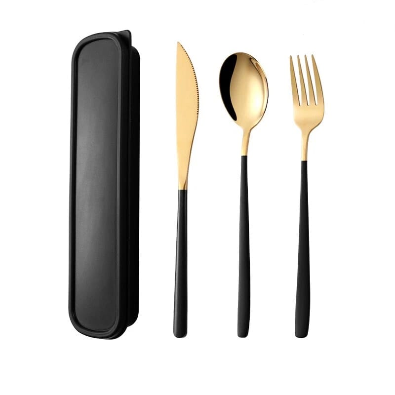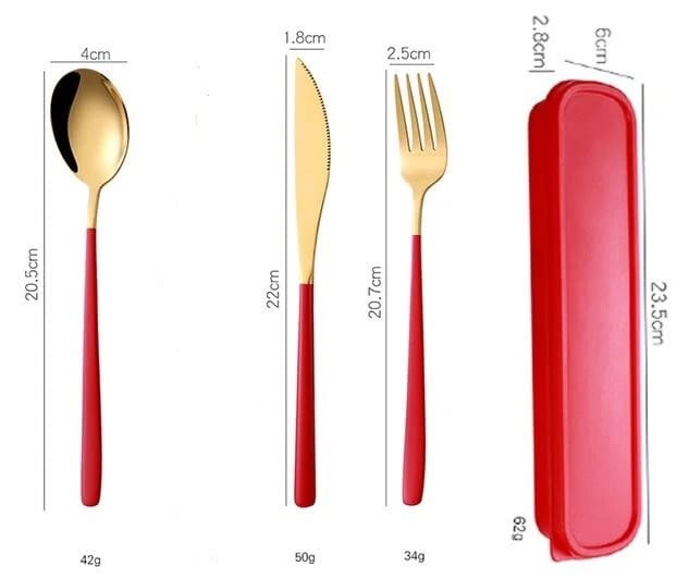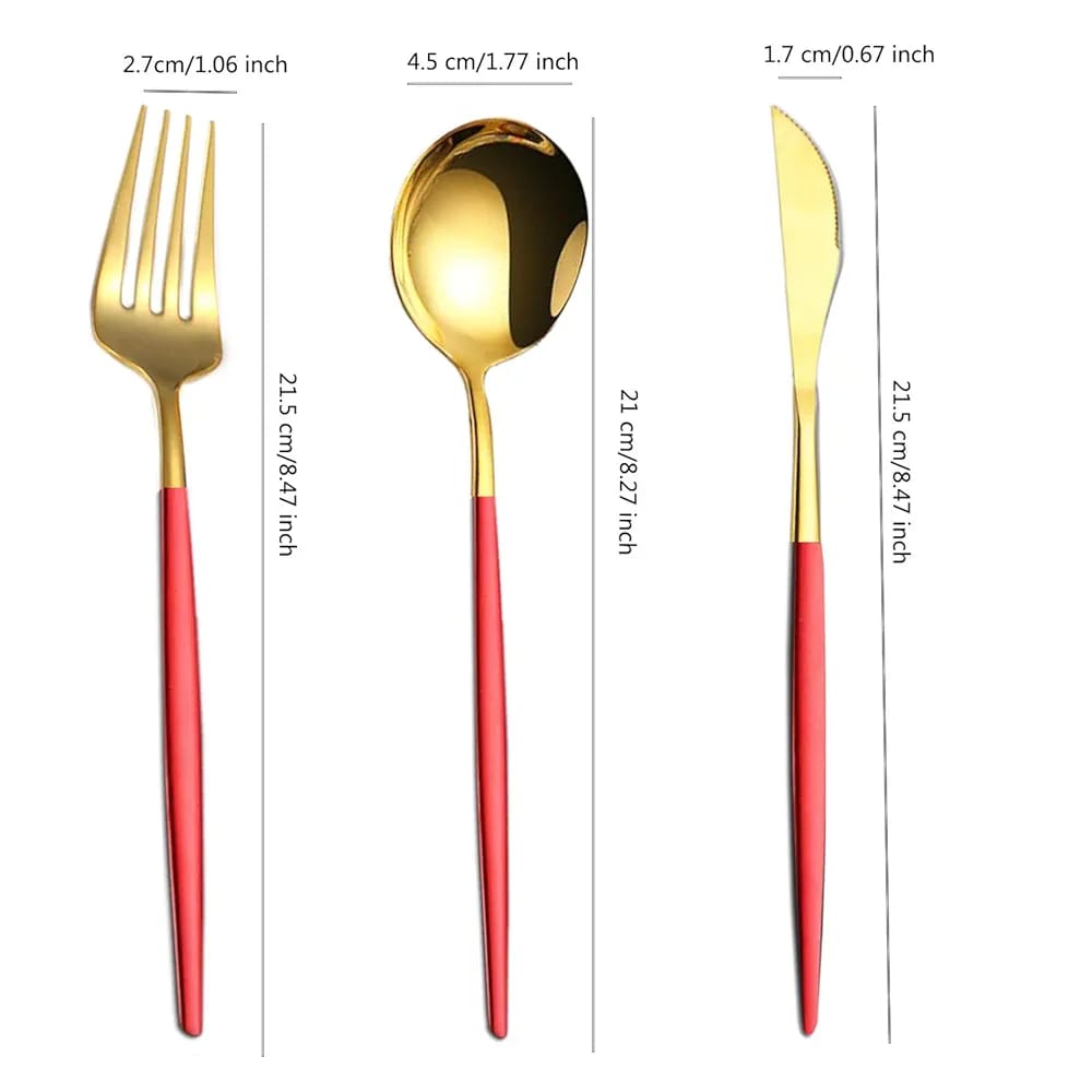 Elegancia y practicidad en un solo set. Este juego de cubiertos incluye tenedor, cuchara y cuchillo de acero inoxidable con acabado dorado y mangos de colores modernos.