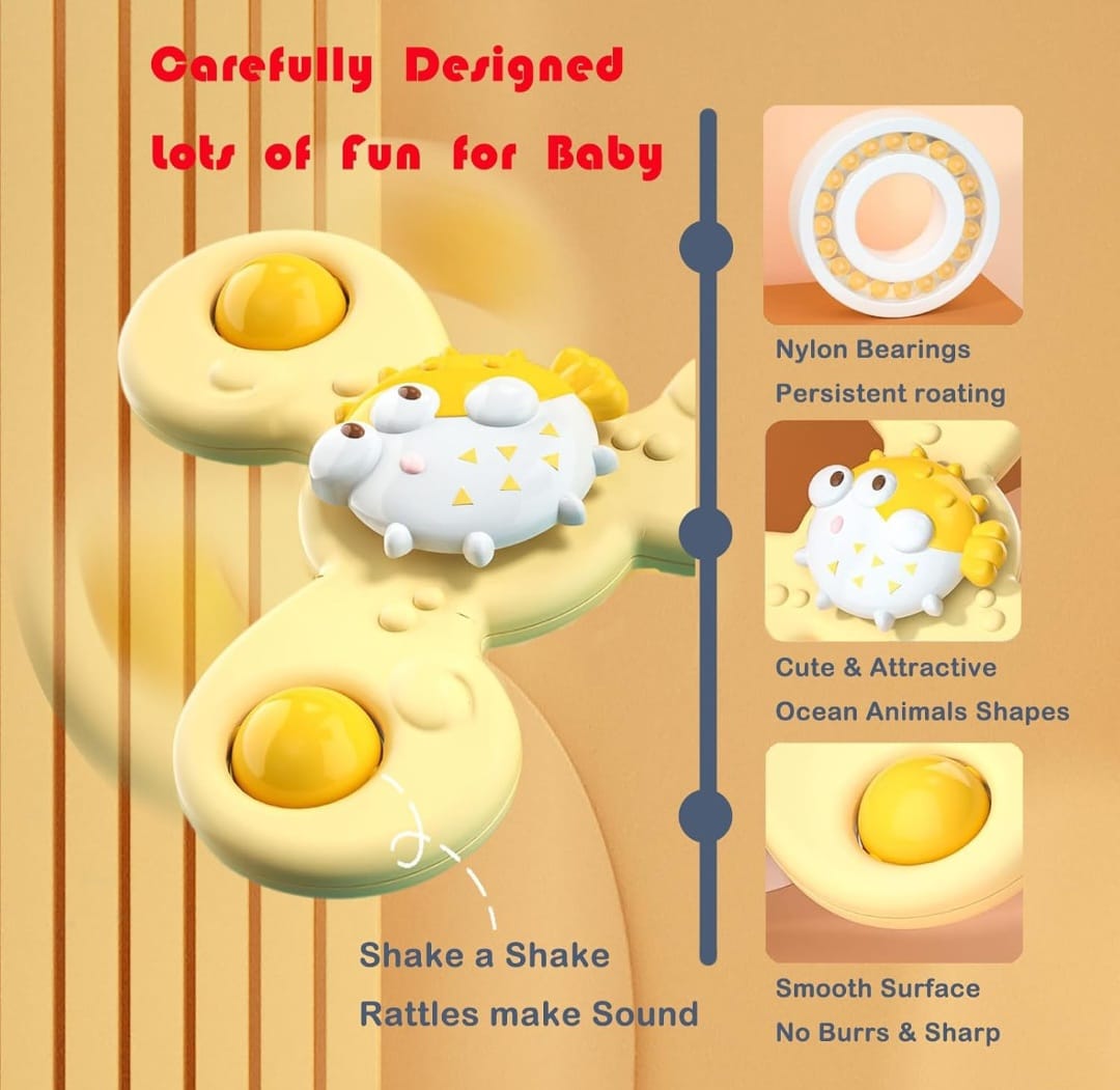 Trío de juguetes giratorios con ventosas con diseños de animales marinos, delfin, pez globo y pulpo.